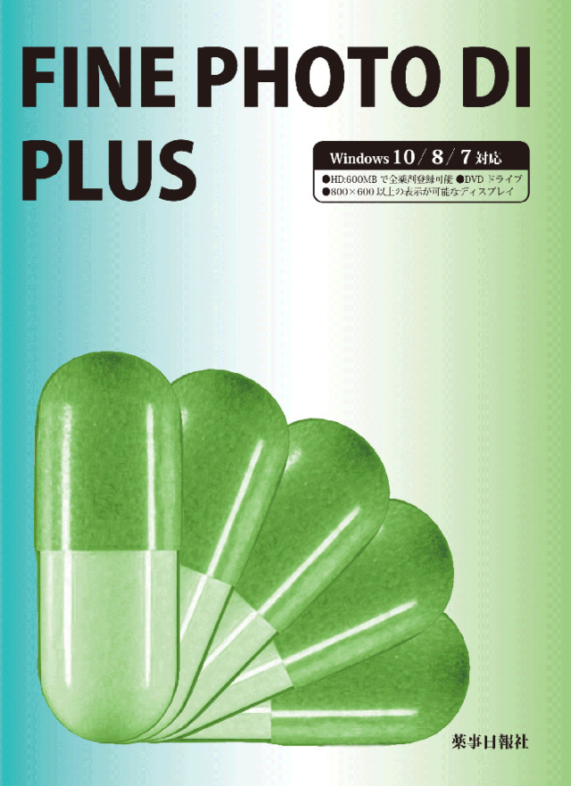 医療用医薬品約12000品目の包装写真と剤形写真を収録した「Fine Photo DI」に患者服薬指導文を”プラス”したデータ集、薬剤情報提供書(薬情)発行システムと薬情作成に使用する薬剤管理システム・薬歴管理システムから構成される『Fine Photo DI/Plus』アプリケーションを搭載したDVD-ROM。